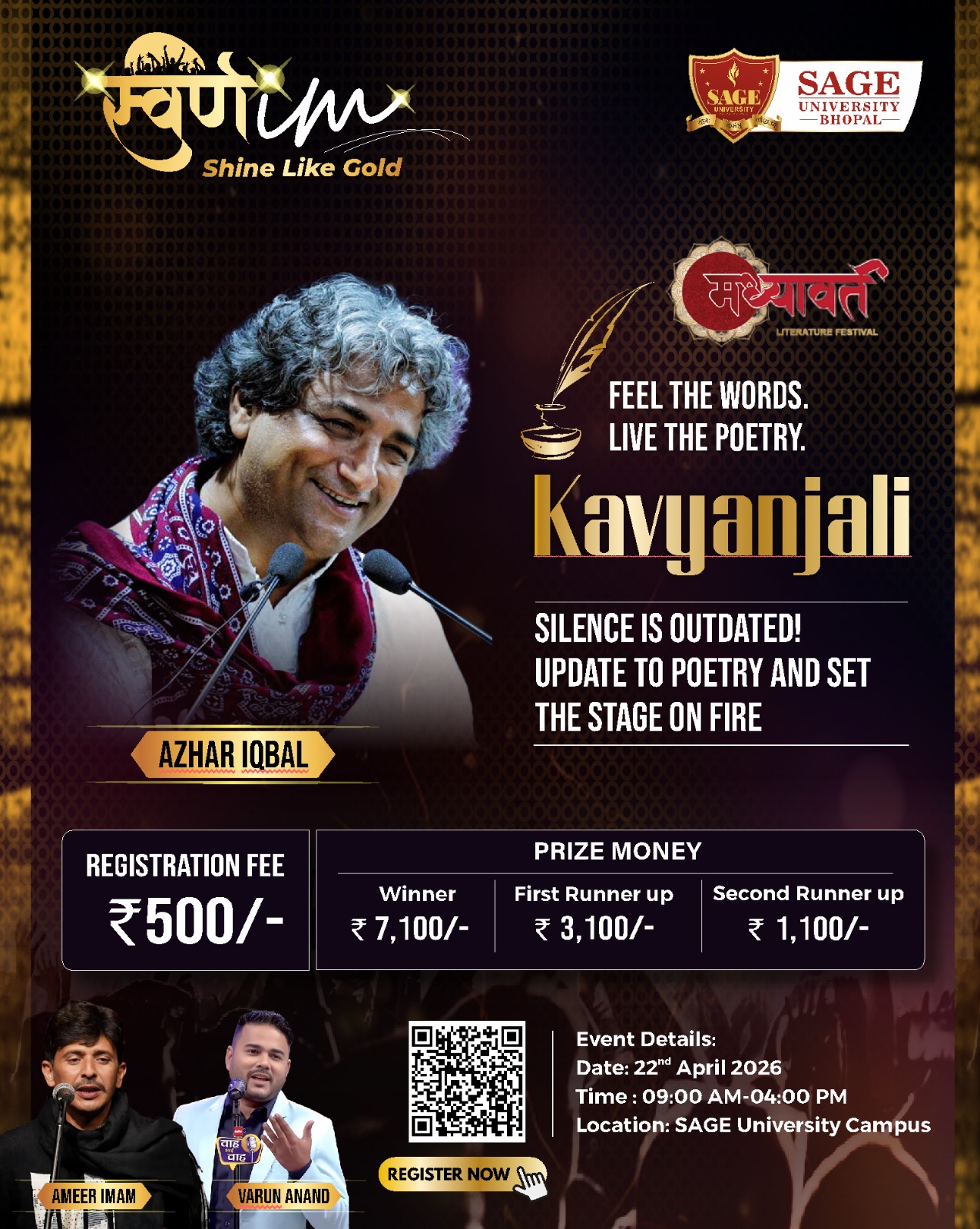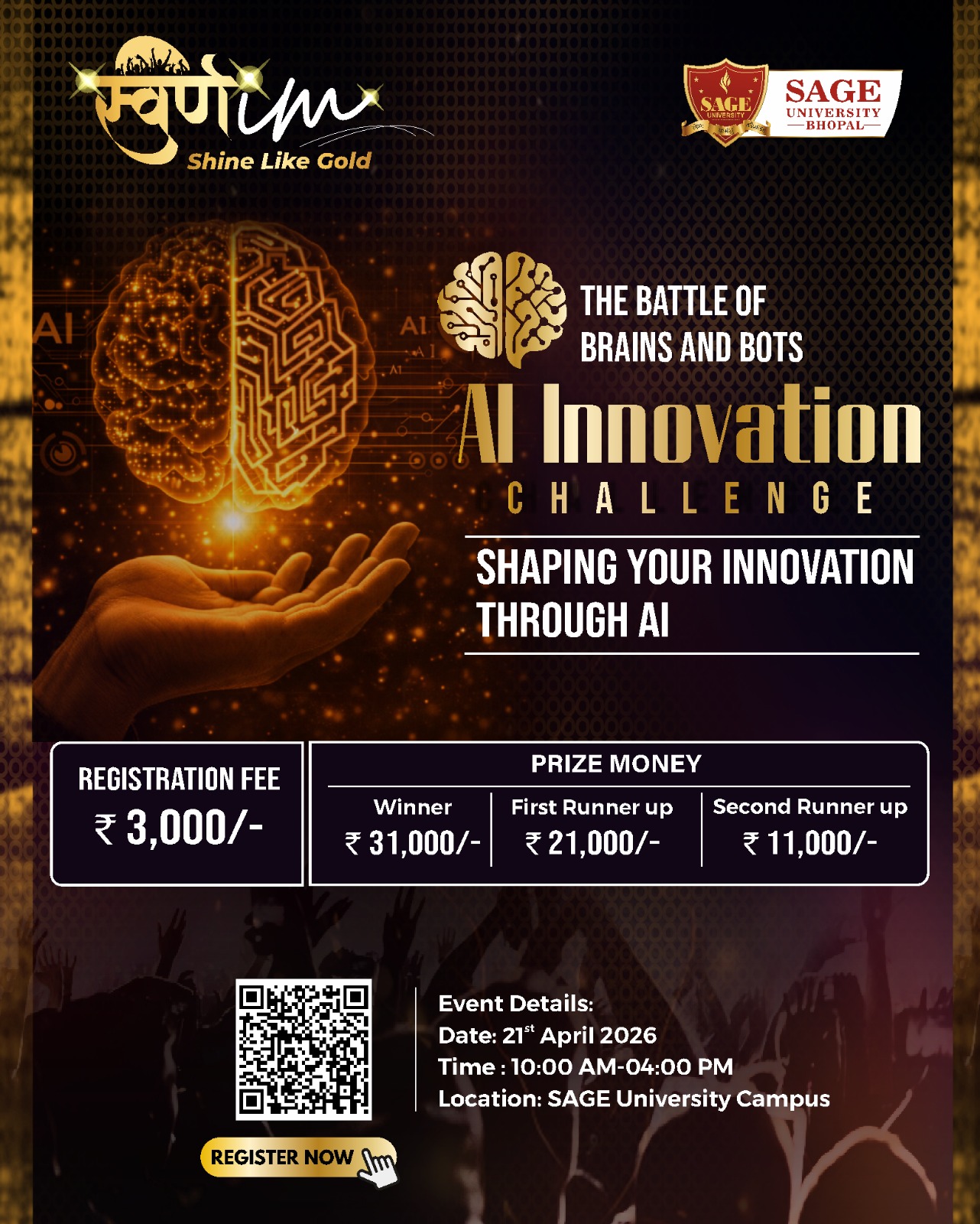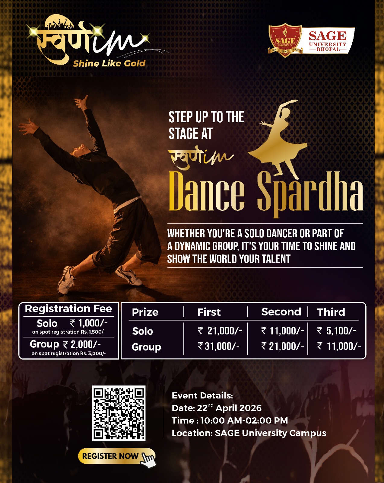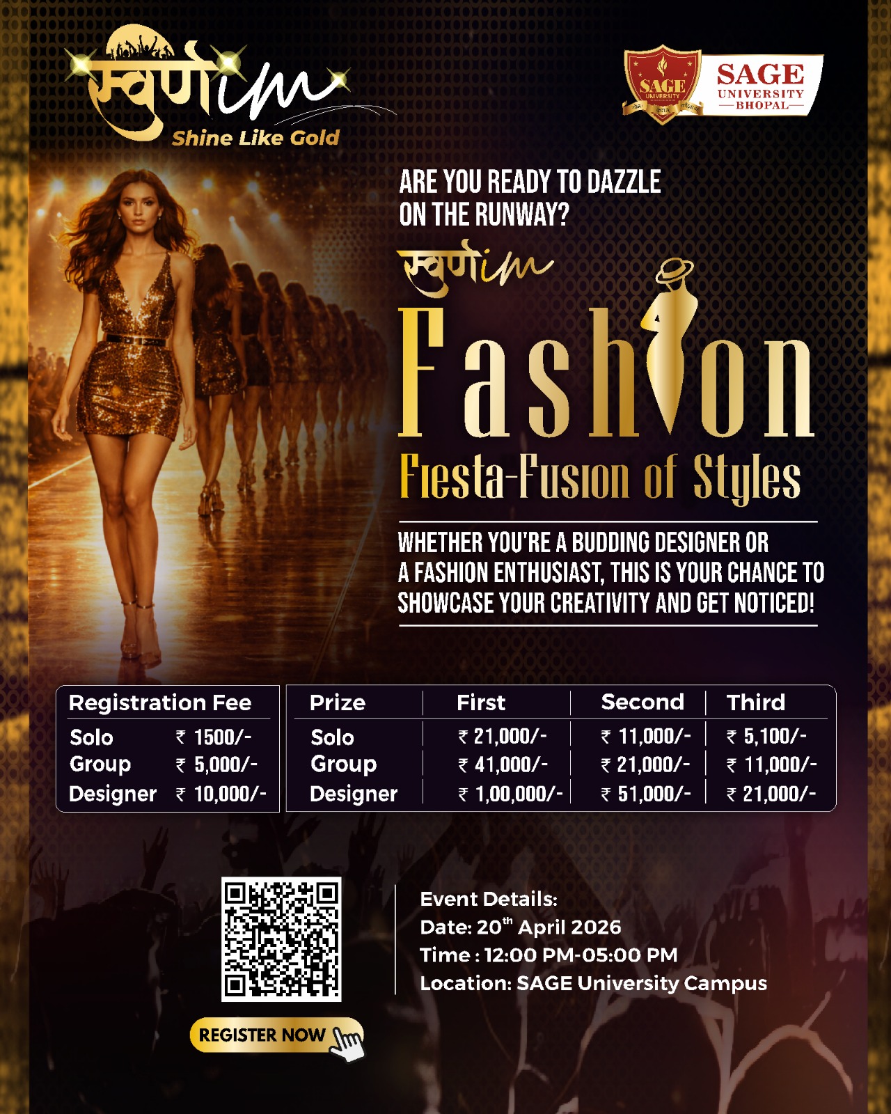 At SAGE University Bhopal stands as the University’s most illustrious annual festival—an emblem of youthful dynamism, cultural plurality, intellectual rigour, and creative excellence. Following the overwhelming success of SWARNIM 2024 & 2025, the 2026 edition aspires to elevate the festival into a nationally benchmarked showcase of talent, integrating digital creativity, performing arts, scholarly exhibitions, entrepreneurial innovation and grassroots engagement.🎤🖊️🏆🥇💃🎻🎼🎼🎼🎼